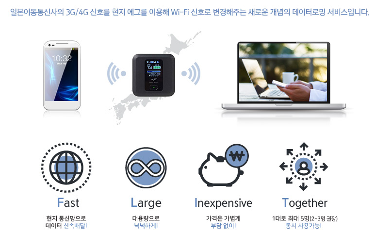 ‘와이파이도시락’은 각 나라의 이동통신사 신호를 Wi-Fi로 전환해주는 데이터 로밍 전용 단말기입니다. 이름 그대로 ‘와이파이’는 데이터를, ‘도시락’은 휴대성을 상징하는데요, 도시락처럼 작고 가벼운 기기 하나만 챙기면 언제 어디서든 자유롭게 인터넷을 이용하실 수 있습니다.